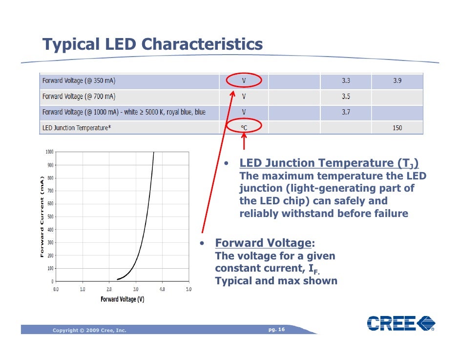 Thermal Management of Cree Forward voltage decreases as the junction temperature of an LED increases. This is shown on each of Cree’s XLamp LED data sheets as the temperature coefficient of voltage, and varies slightly depending on the color and package type. ... Access Doc